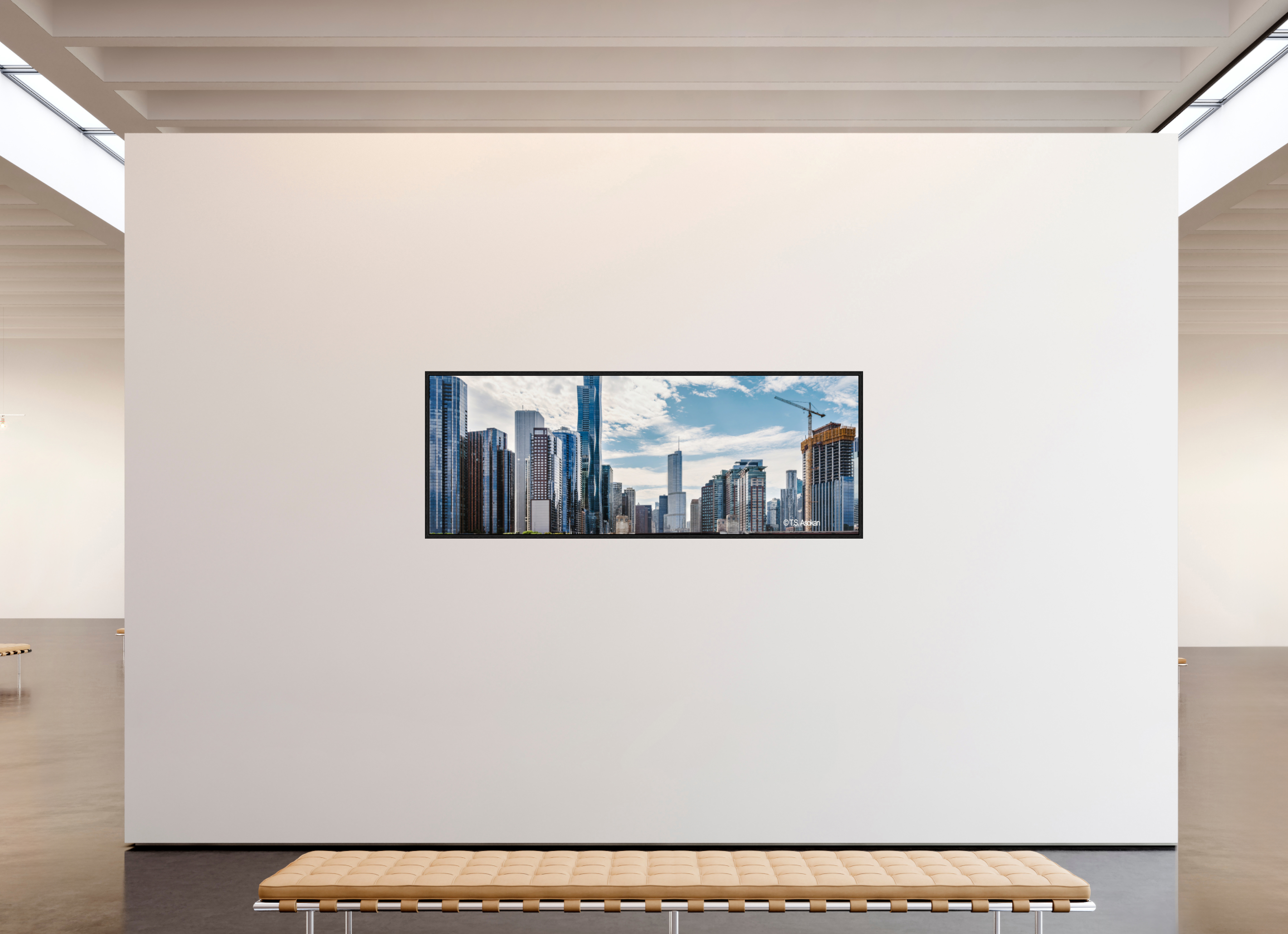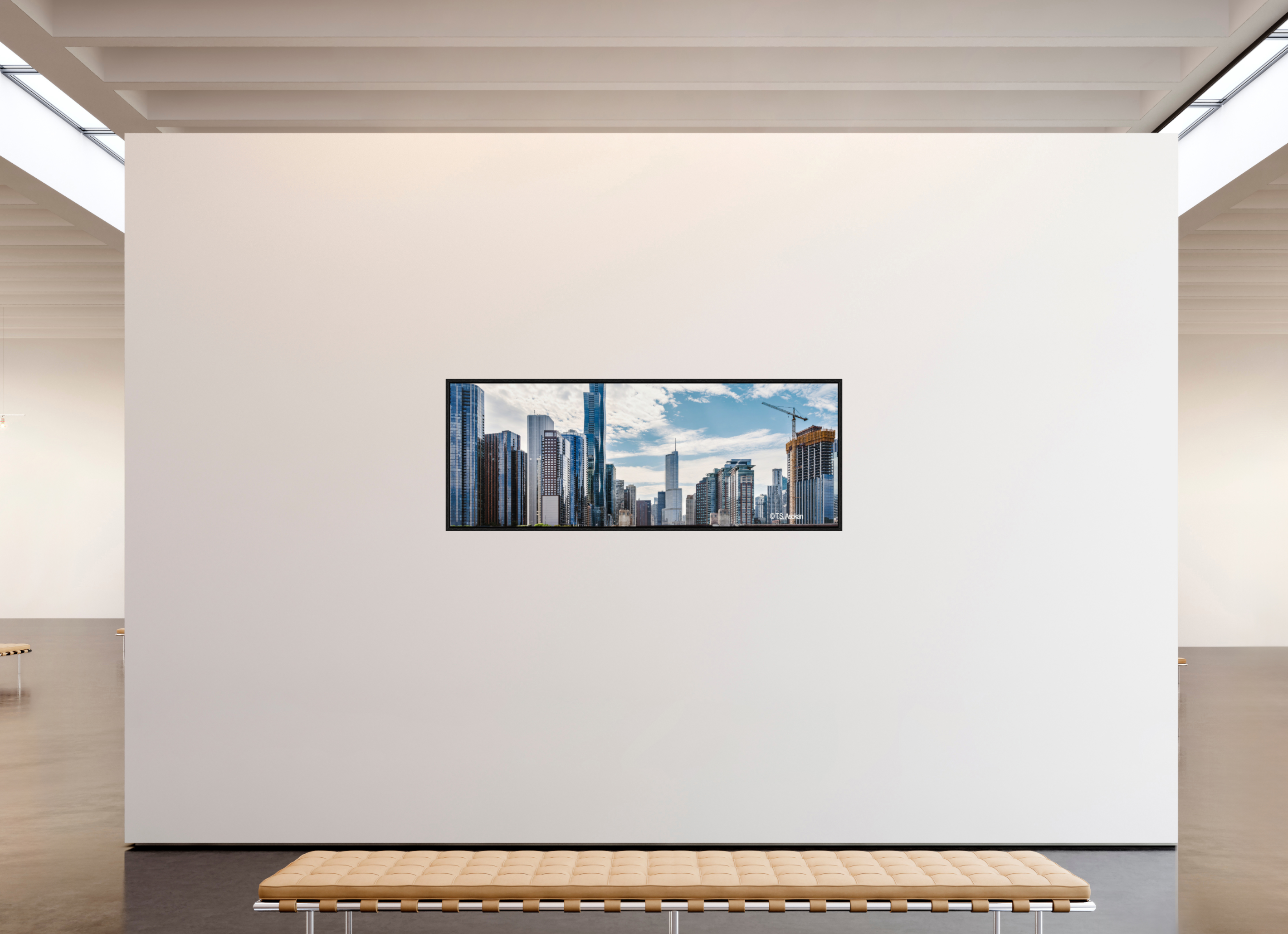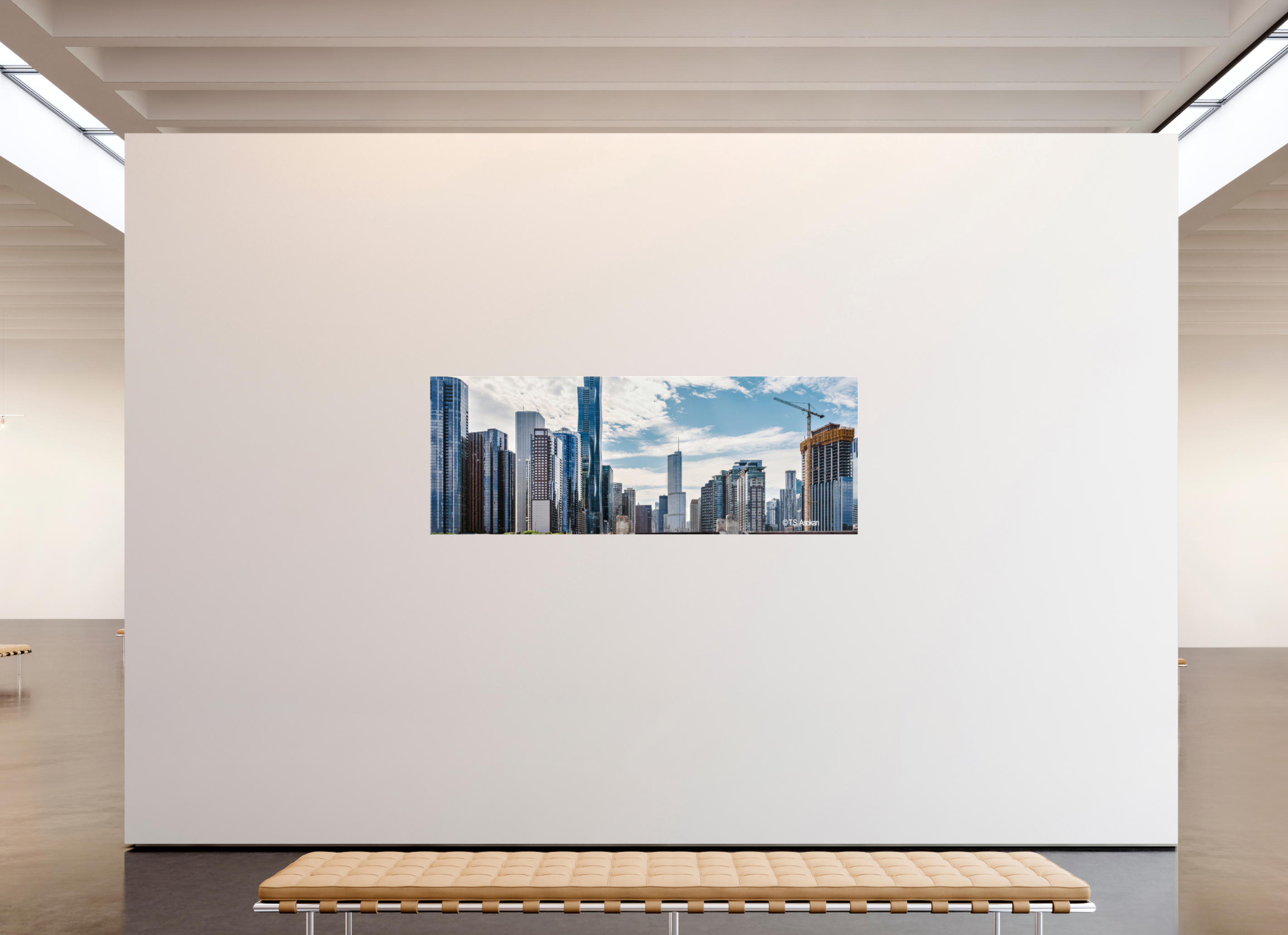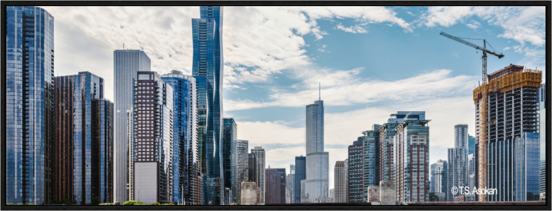 A crystalline sweep of the East Loop skyline: the three-stack St. Regis Chicago (formerly Vista Tower) rises in rippling glass beside the spire of Trump International Hotel & Tower—all under a luminous Midwestern sky. This panoramic skyline centers two of Chicago’s modern landmarks. To the left, the 101-story St. Regis Chicago steps upward in a trio of frustums—interlocking, tapering forms that catch the light in shifting blues and silver. Completed in 2020, it stands as Chicago’s third-tallest building and the tallest in the world designed by a female architect (Jeanne Gang, Studio Gang). Near the middle, the sleek silhouette of Trump International Hotel & Tower—Chicago’s second-tallest—rises from the former site of the Chicago Sun-Times. Layered glass towers, a working construction crane at right, and a field of bright clouds complete a view that feels both precise and dynamic. Printed in ultra-high resolution for wall-size display; available on acrylic, HD metal, or canvas, and as a dramatic triptych or multi-panel cluster. Highlights: St. Regis Chicago (2020) — 101 stories, three interlocking frustums Tallest building worldwide designed by a woman (Jeanne Gang) Trump International Hotel & Tower — Chicago’s second-tallest; former Sun-Times site Expansive cloud field, layered glass façades, active skyline with crane Produced on acrylic, HD metal, or canvas; triptych/cluster options