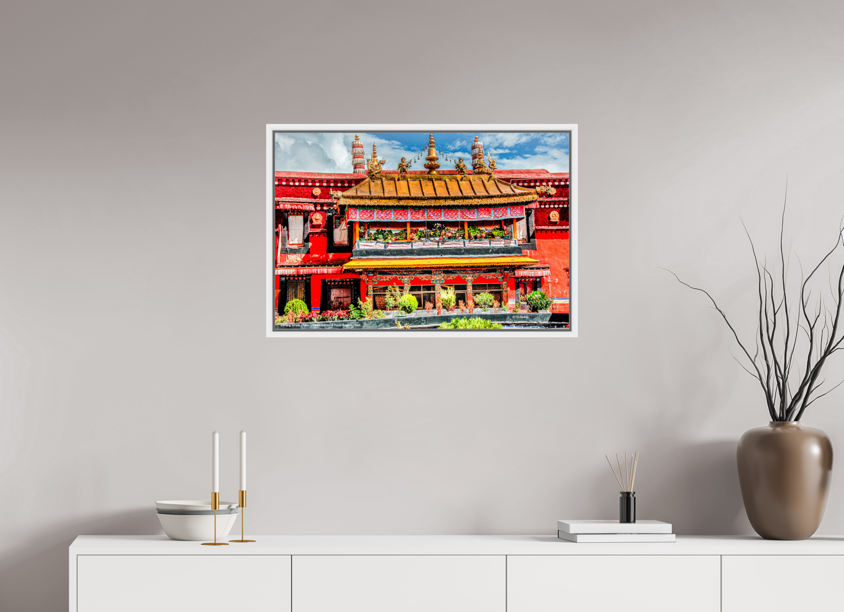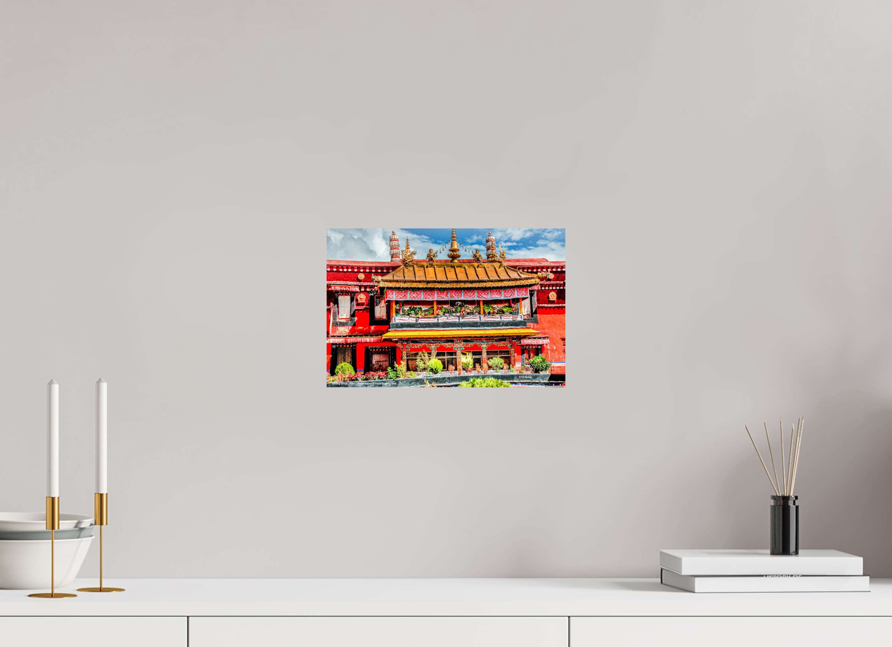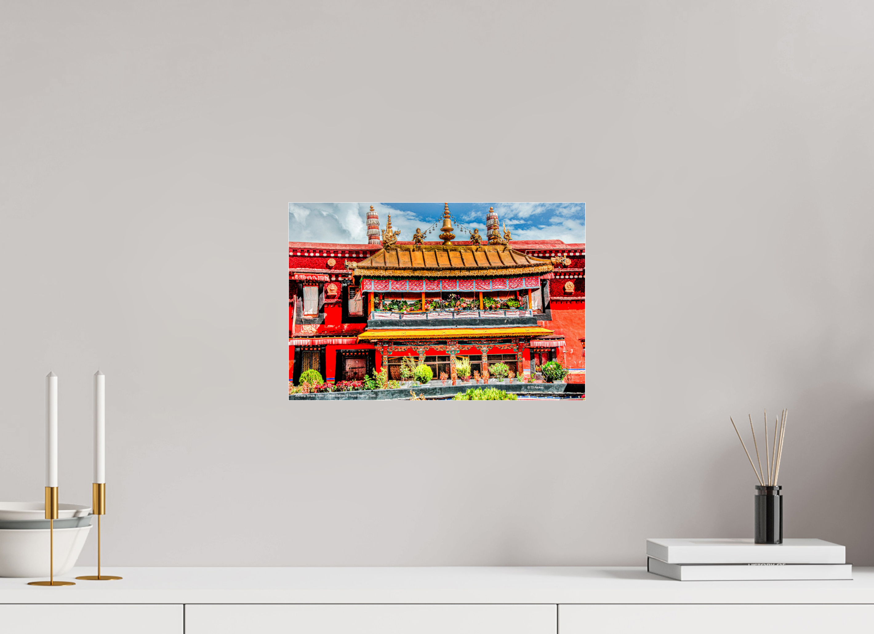 A vivid, sunlit view of Jokhang Temple in Lhasa—Tibet’s most sacred Buddhist site—showing its gilded roofline, prayer banners, and flowered balcony in brilliant reds and golds. Museum-grade, wall-size print crafted and shipped worldwide by WhiteWall.