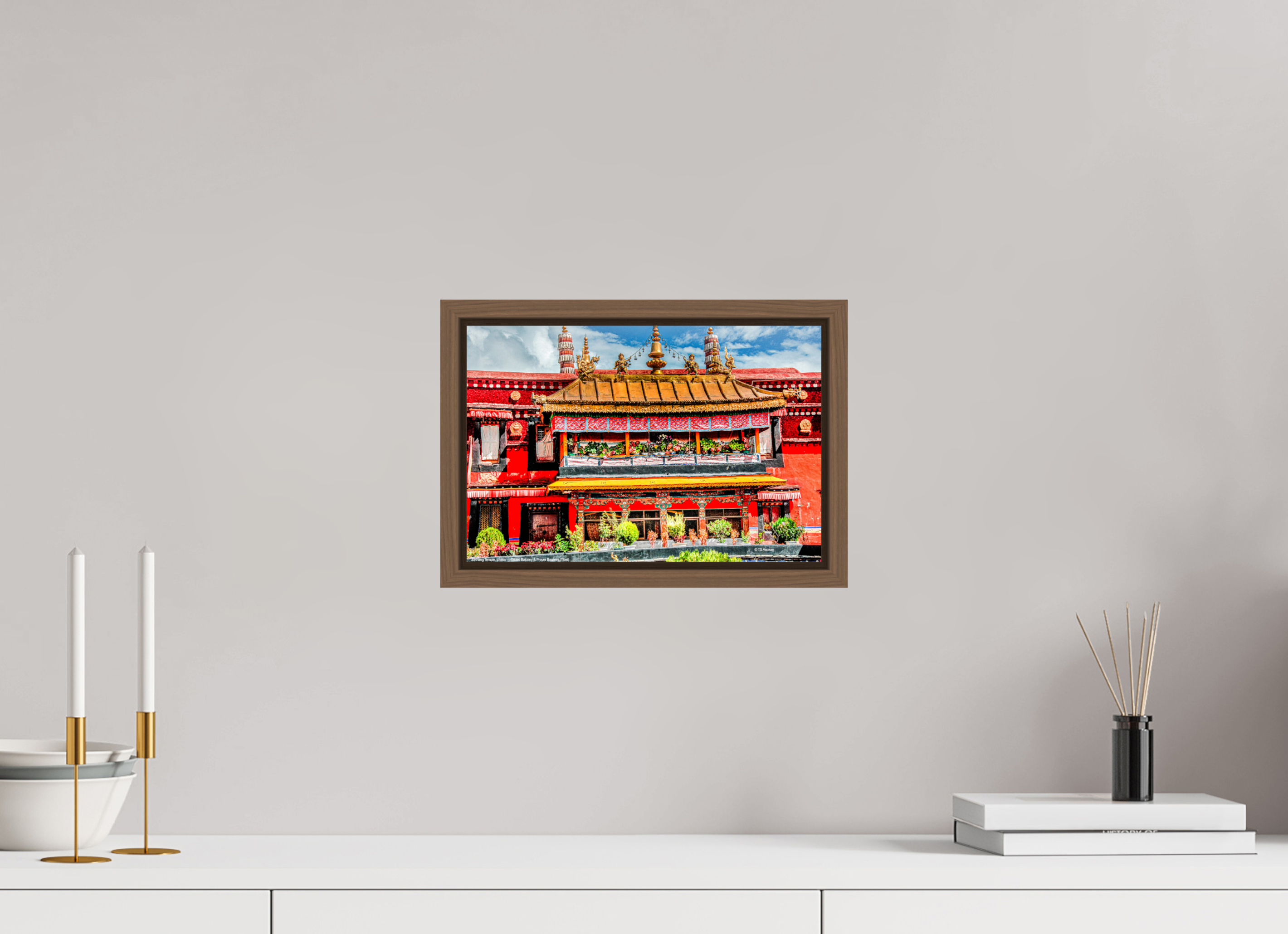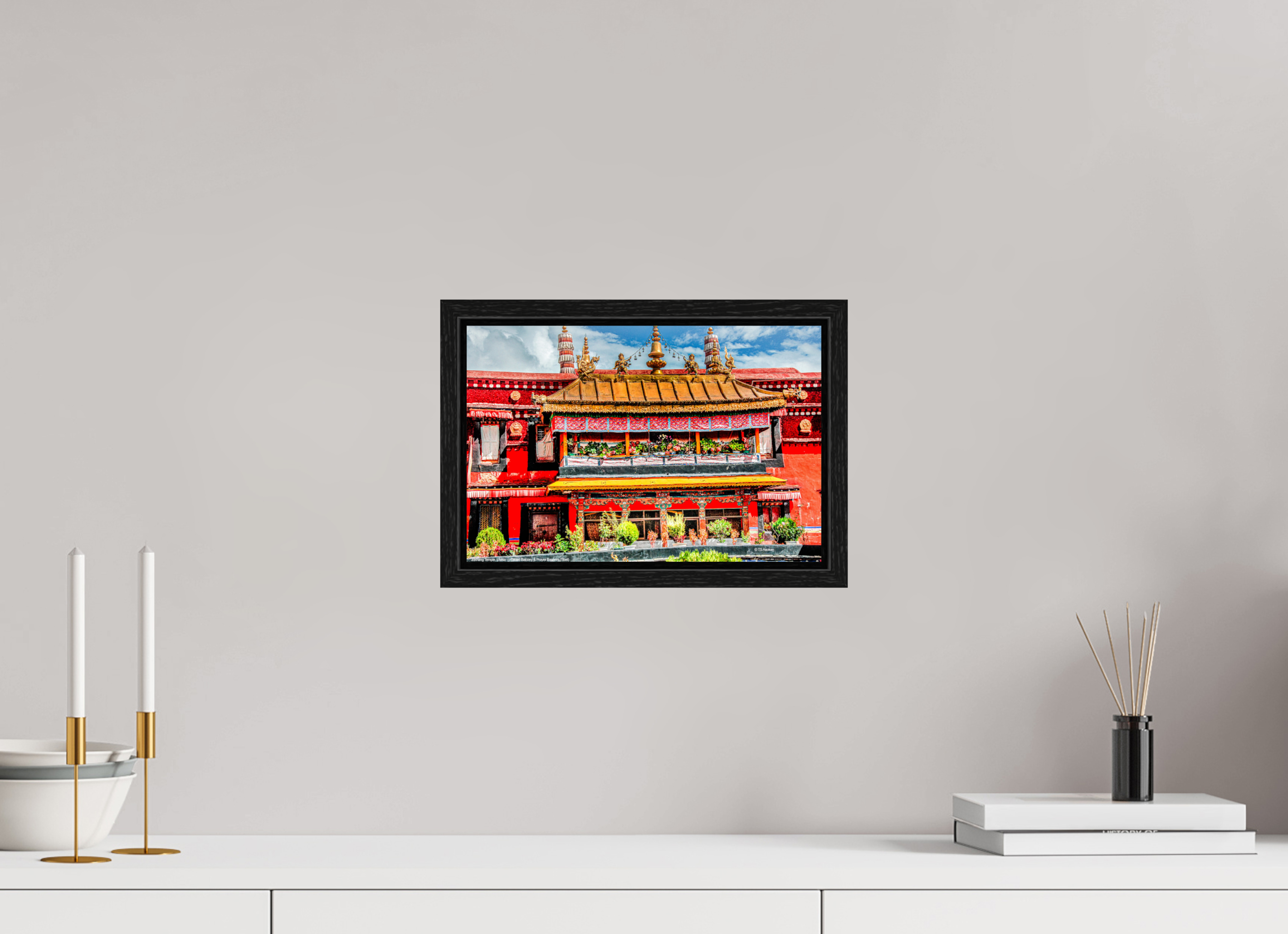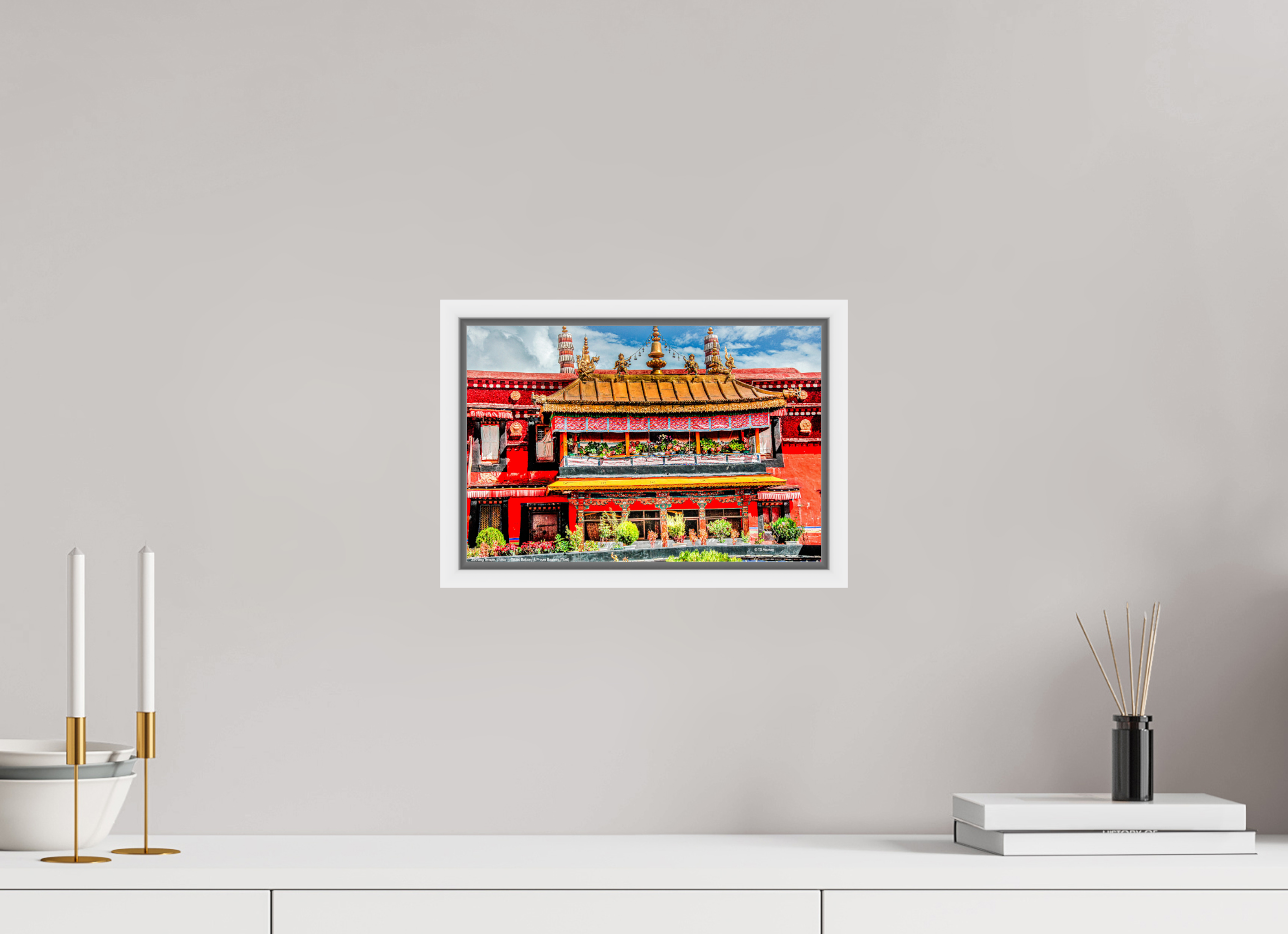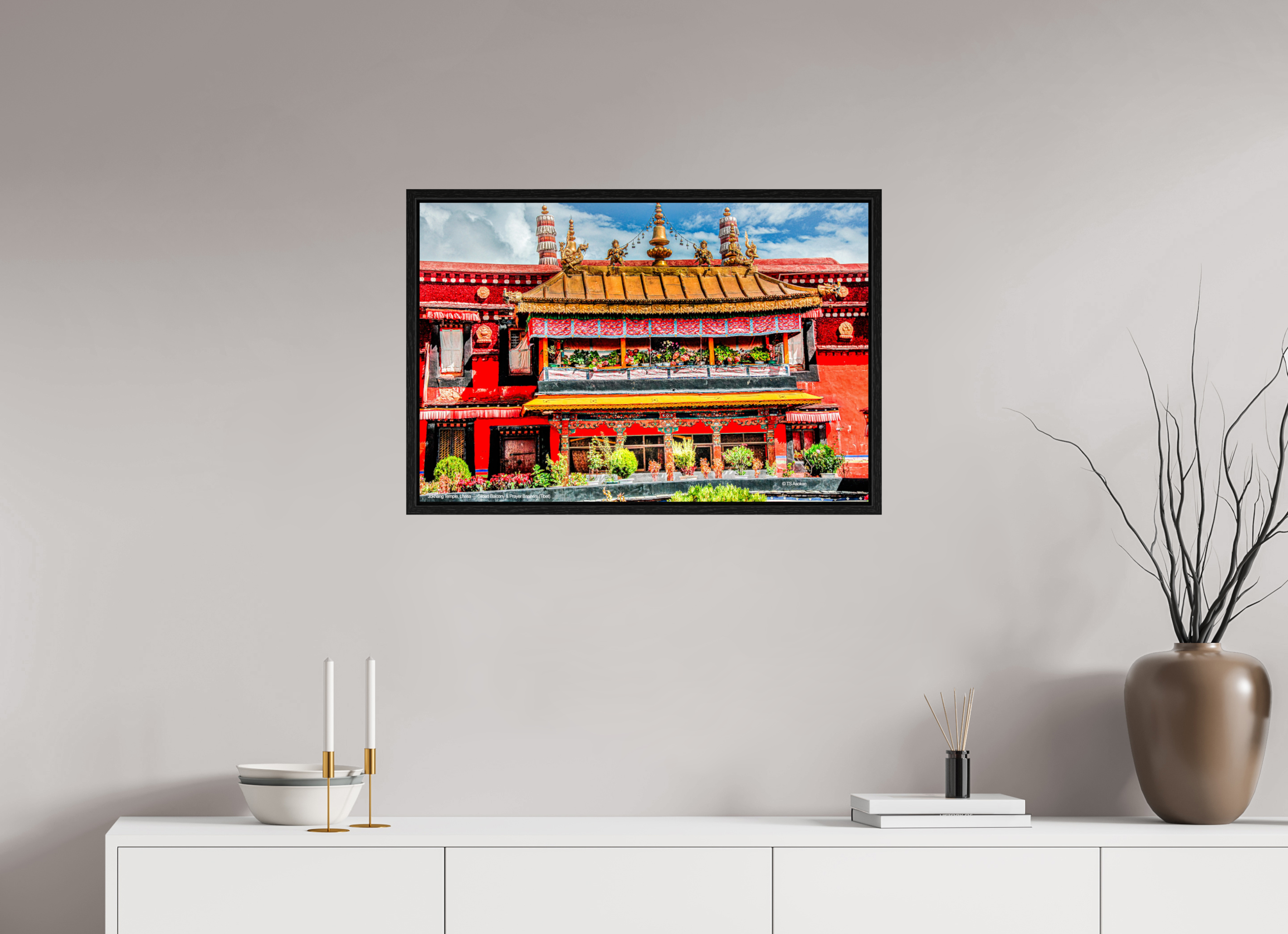 A vivid, sunlit view of Jokhang Temple in Lhasa—Tibet’s most sacred Buddhist site—showing its gilded roofline, prayer banners, and flowered balcony in brilliant reds and golds. Museum-grade, wall-size print crafted and shipped worldwide by WhiteWall.